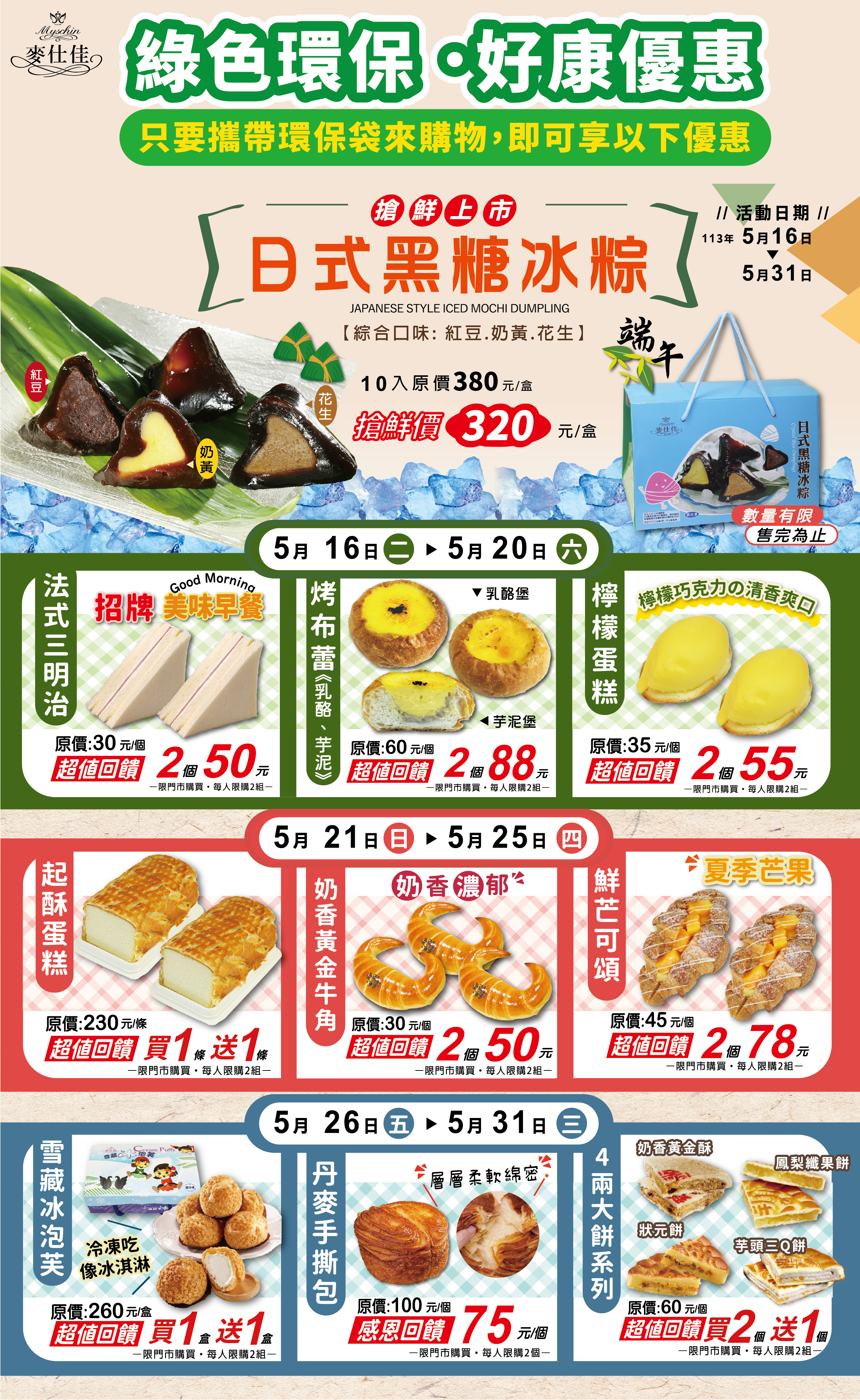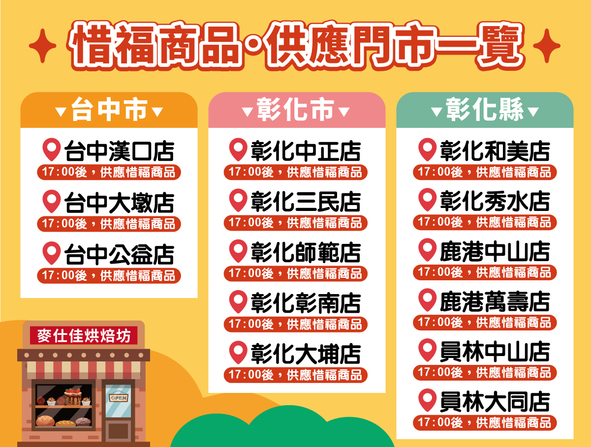 麥仕佳於中彰14家門市,每日皆供應限量惜福商品,為回饋消費者,這些「惜福商品」以優惠價格販售,讓每位品味者都能在經濟實惠的同時,參與共同守護環境的行動。堅持不浪費,讓美味源源不斷地與大家相伴。