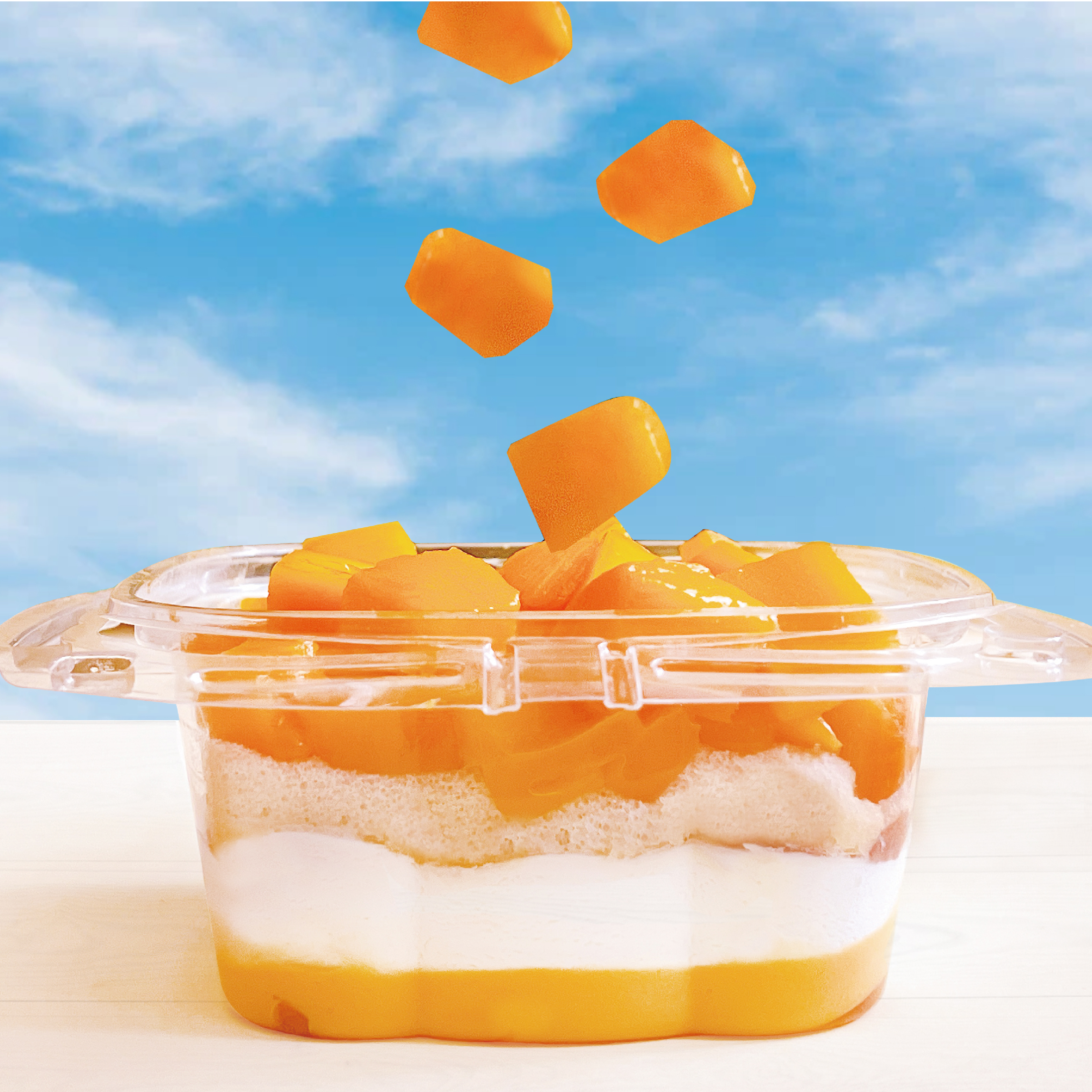 嚴選頂級原物料、屏東枋山愛文芒果,滿滿新鮮.現切的愛文芒果丁。搭配6倍奶製作,奶香清爽濃郁的奶霜餡,打造夢幻4層 :酸甜愛文芒果&香草蛋糕.絲滑奶醬.Q彈芒果布丁,美味又高品質享受。
