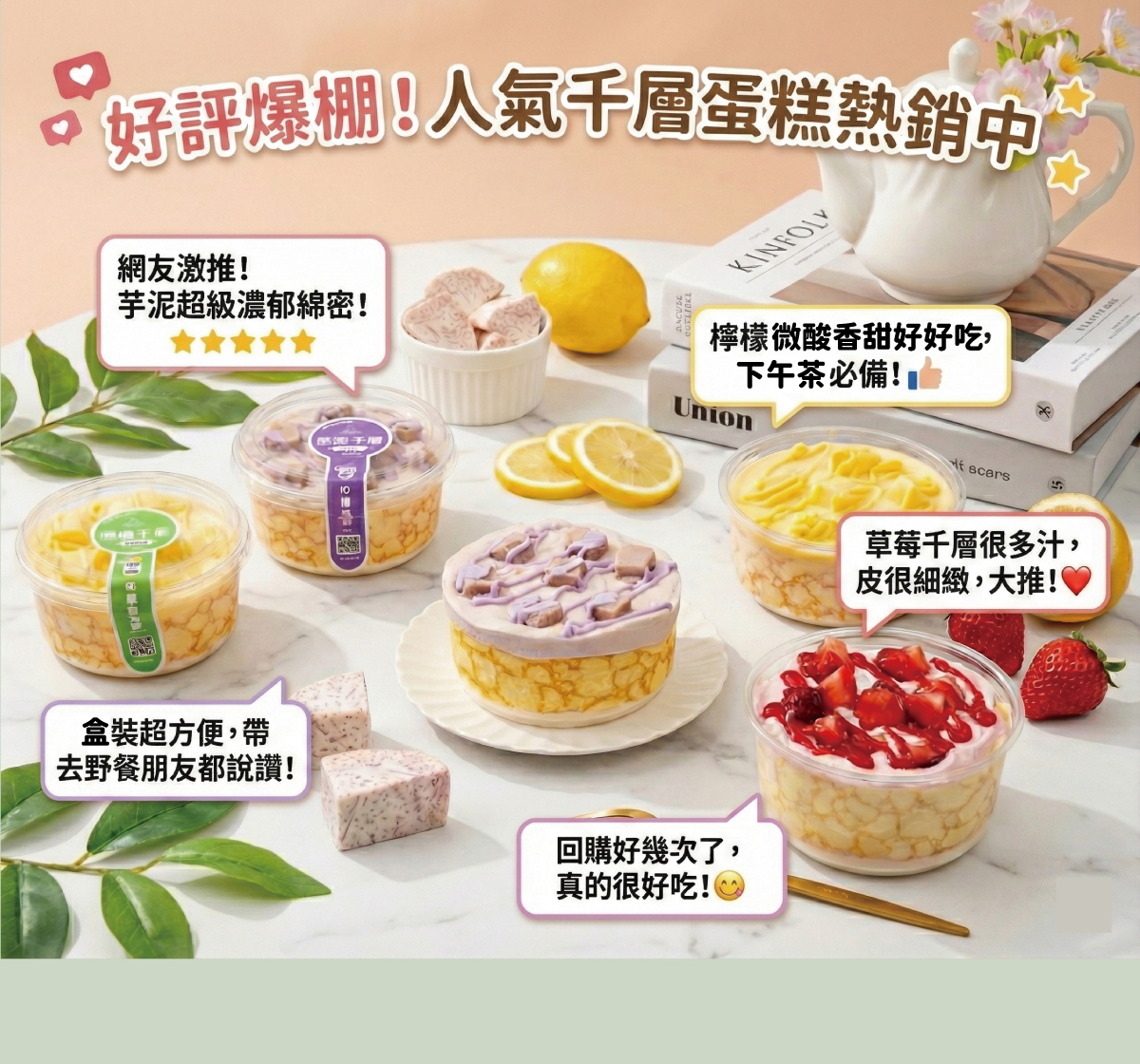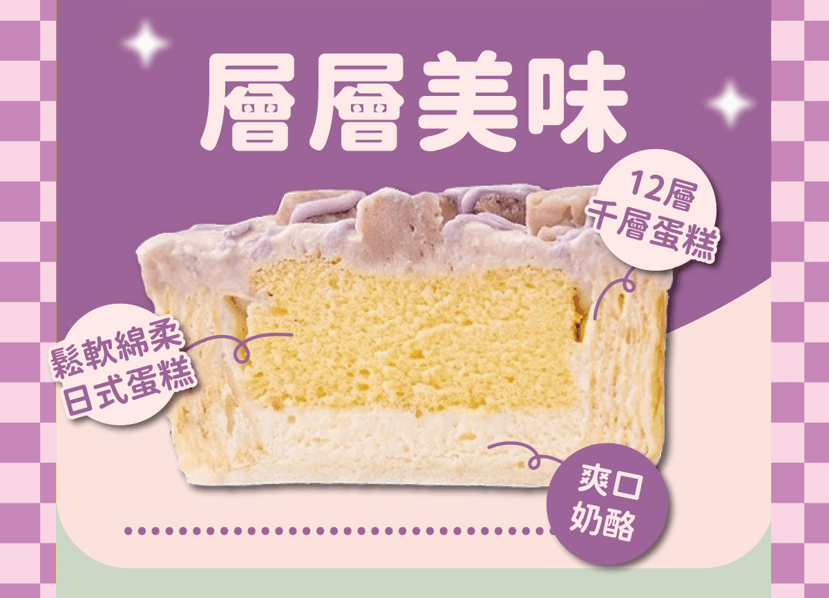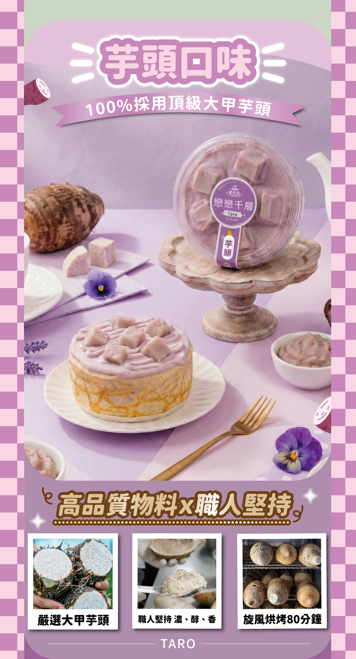 選用大甲芋頭帶皮烘烤,綿密厚香、自然甘甜,濃郁芋泥,搭配千層蛋糕,層層堆疊出濃郁而不膩的美味。